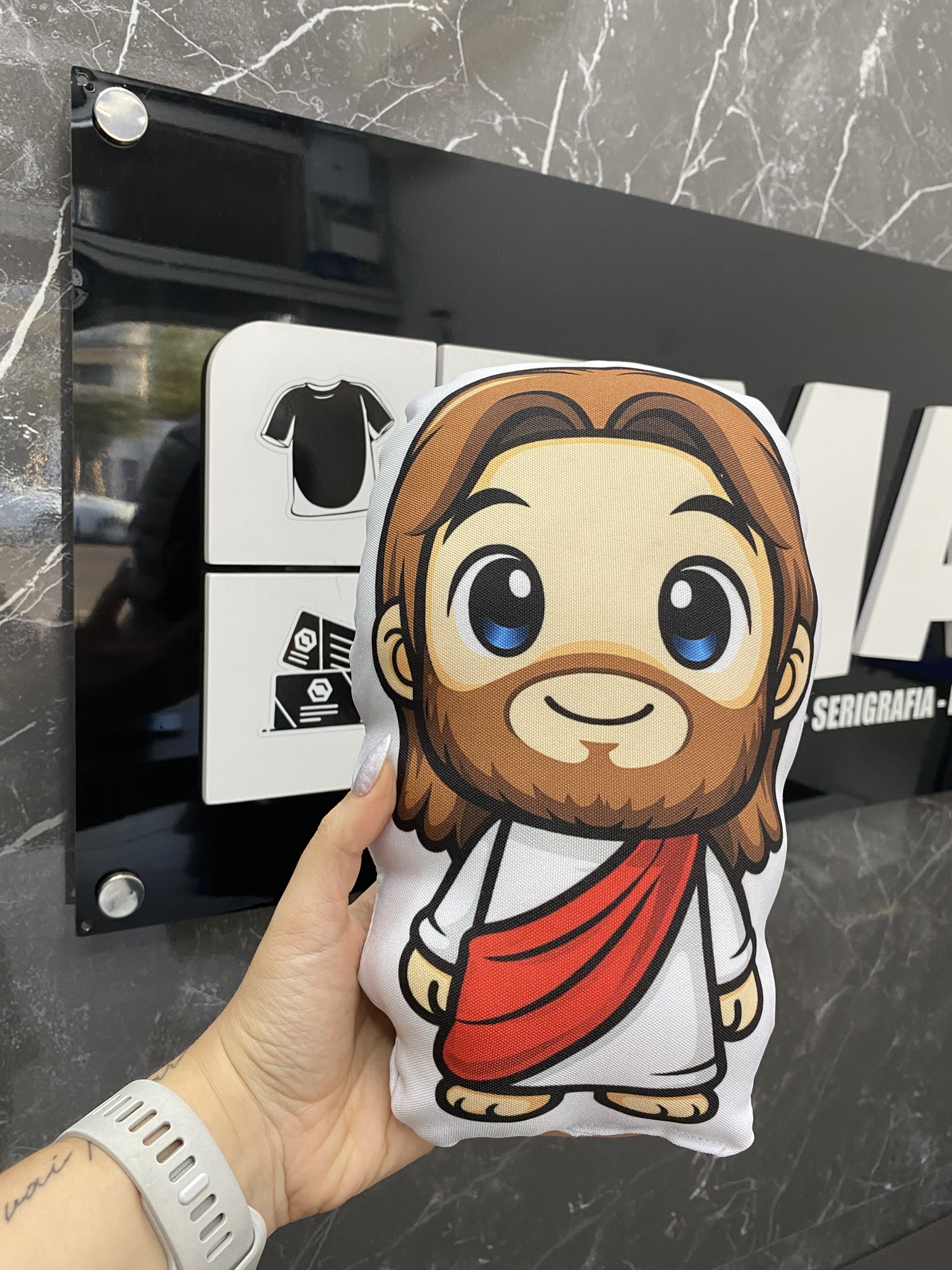 Almofada infantil com Jesus em versão cartoon 💛